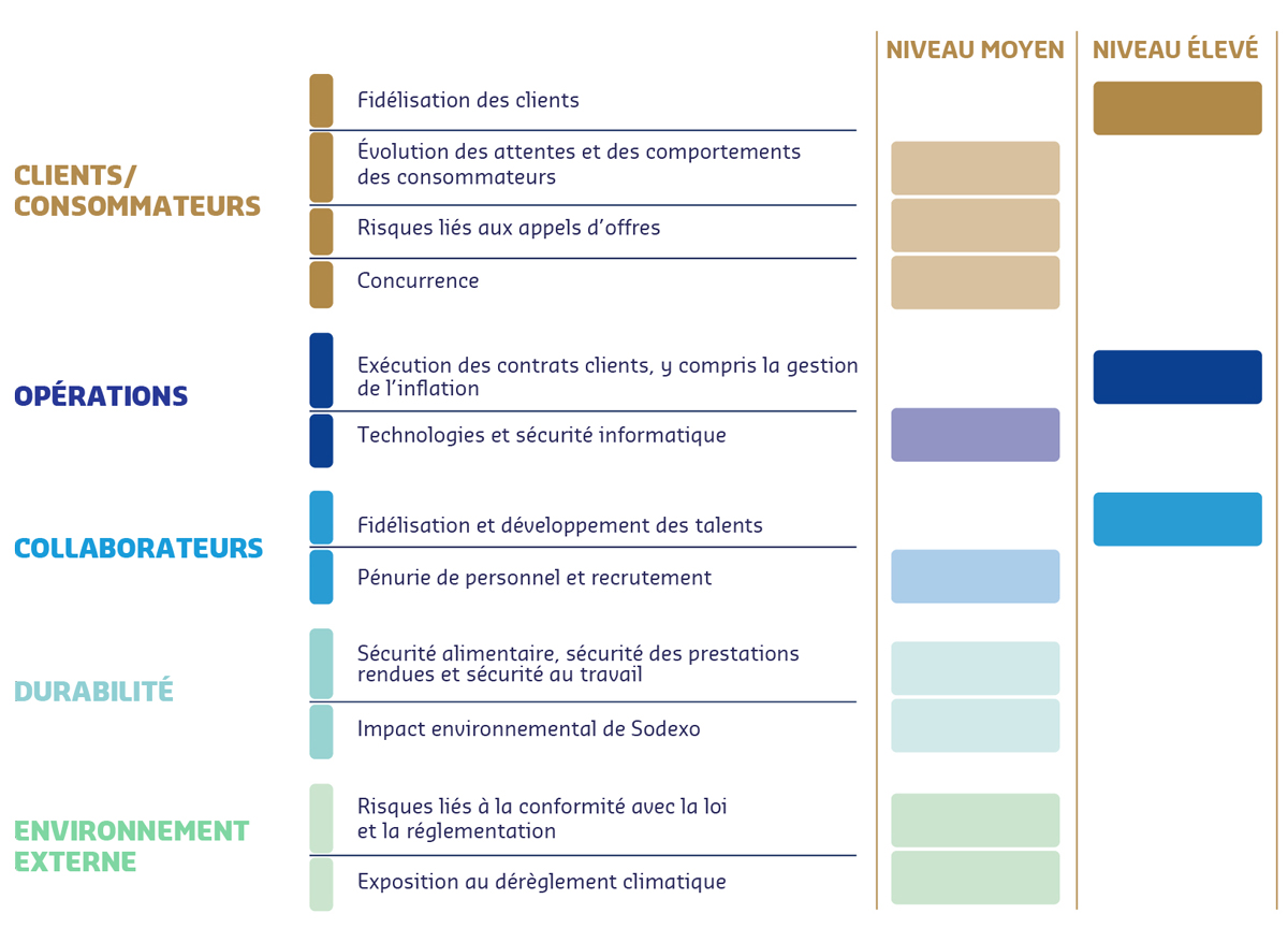 Sodexo exerce ses activités dans un environnement en permanente évolution et est exposé à des risques susceptibles d’avoir un effet négatif, notamment sur ses opérations, sa situation financière et sa réputation. Pour prendre les meilleures décisions commerciales, protéger ses actifs et soutenir ses priorités stratégiques, le Groupe adopte une approche proactive pour anticiper et gérer ces risques.