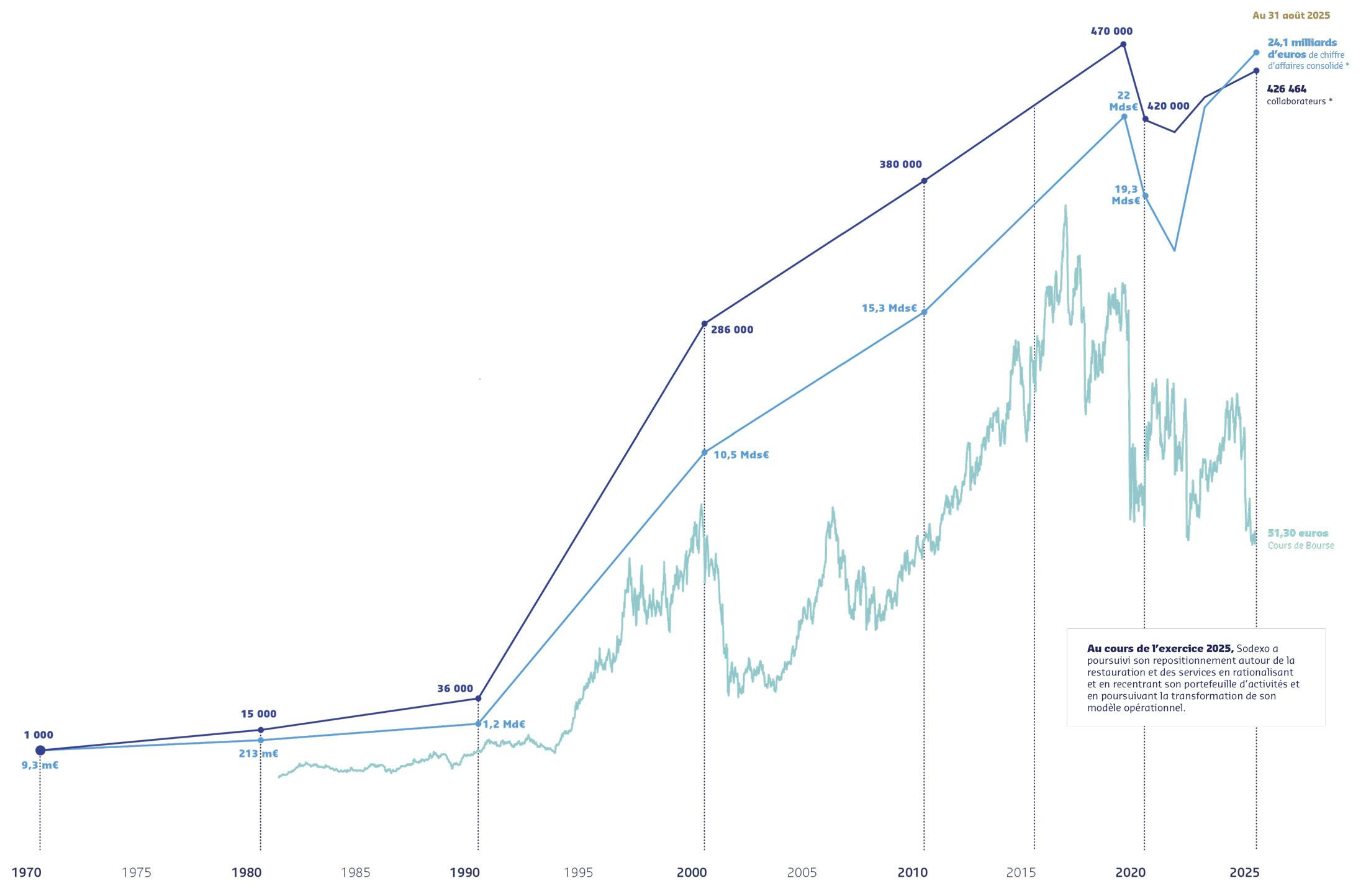 L'infographie illustre la trajectoire de croissance de l'entreprise depuis 1970 jusqu'à 2025, avec des repères historiques clés et des chiffres importants relatifs au nombre de collaborateurs et au chiffre d'affaires :