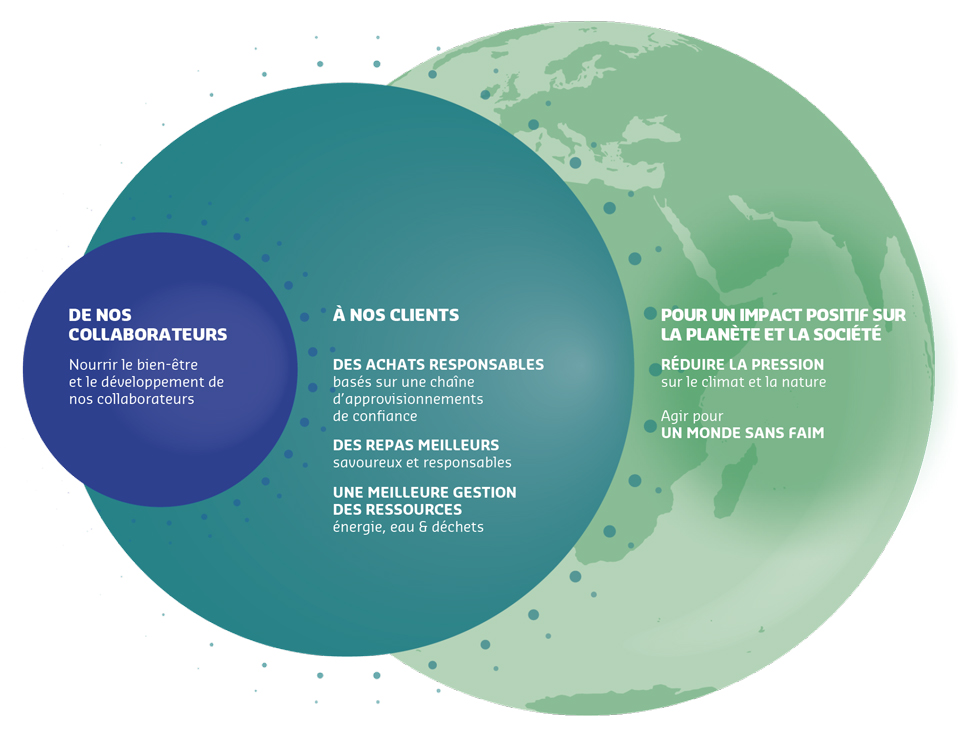 L'overlap entre ces domaines montre comment l'entreprise relie ces engagements pour un impact global, soulignant les initiatives qui profitent à la fois aux collaborateurs, aux clients et à la planète.