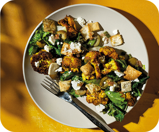 Chou-fleur rôti au curcuma, scarole et feta, vinaigrette aux graines de moutarde marinées et aux olives, et croûtons de pita.