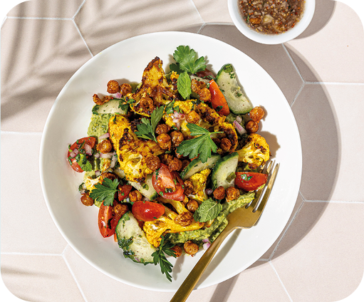 Houmous aux épinards et à l'avocat avec chou-fleur au curcuma, salade de concombre et de tomates, pois chiches croustillants et vinaigrette à l'origan et aux noix.