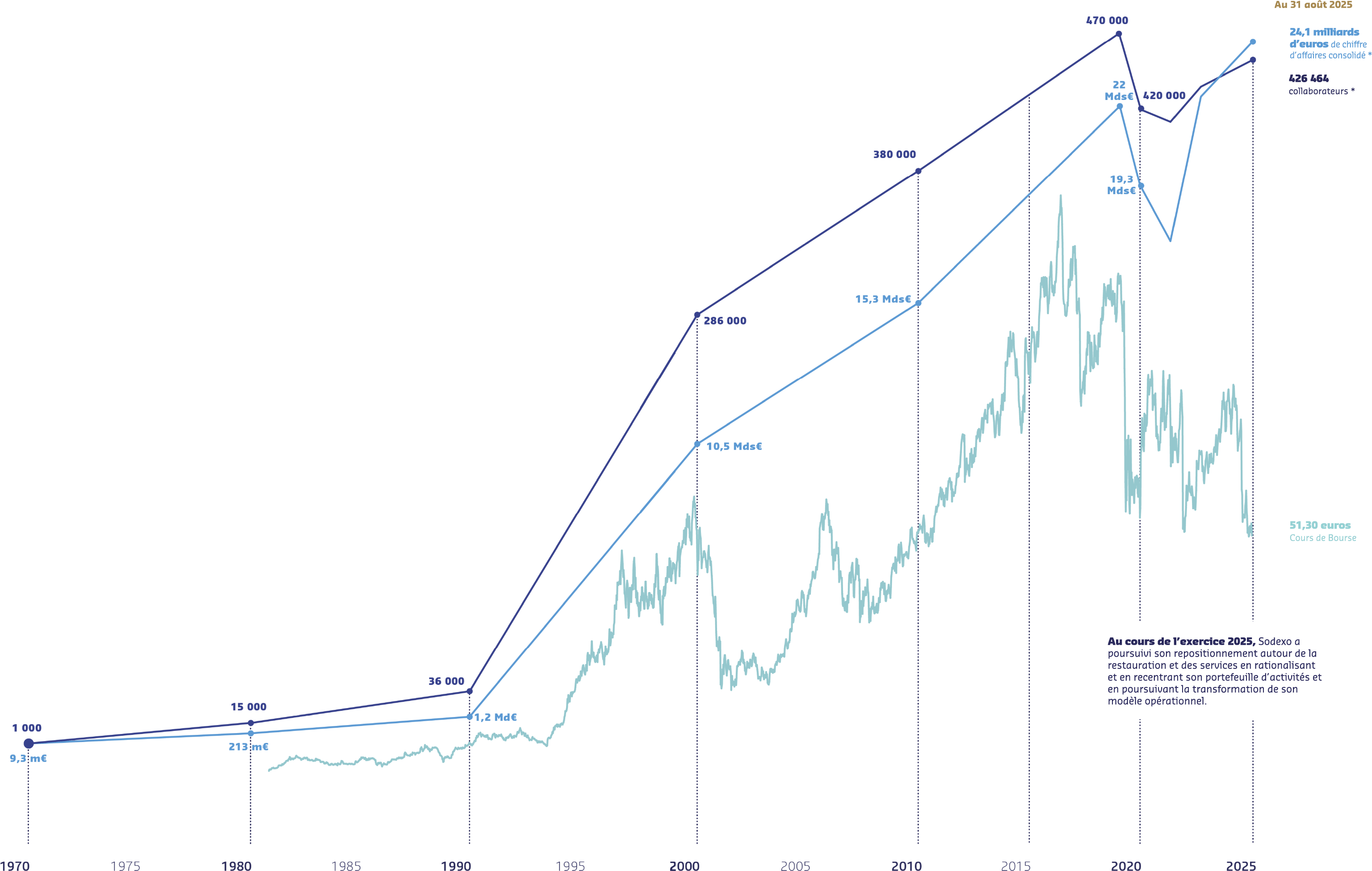 L'infographie illustre la trajectoire de croissance de l'entreprise depuis 1970 jusqu'à 2025, avec des repères historiques clés et des chiffres importants relatifs au nombre de collaborateurs et au chiffre d'affaires :